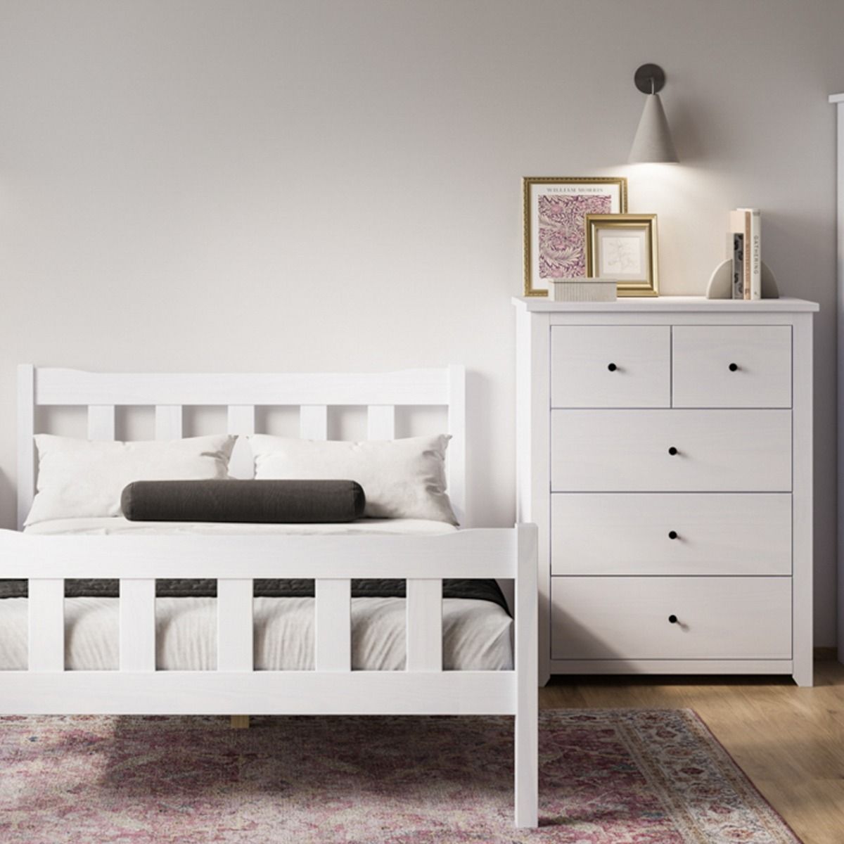 The HARLAN White Chest of drawers features a white-washed pine finish and antique-style handles, providing ample storage with a versatile, neutral tone that suits any decor scheme. Crafted from solid wood, this chest combines functionality with a touch of classic charm.