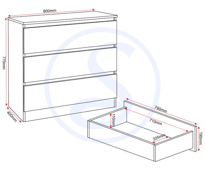 Internal Drawer Space W71cm D32.5cm H11cm, Drawer Front Size W79.5cm H19.5cm, Top Thickness 1.5cm