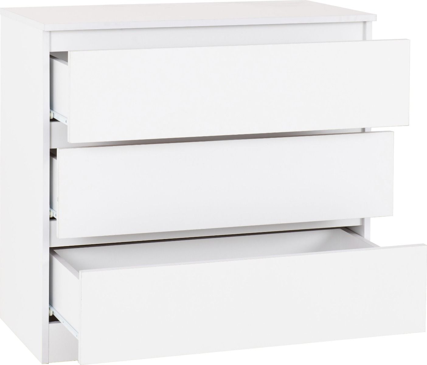 Upgrade your storage with the Malvern 3 Drawer Chest in crisp White finish. Measuring 80cm wide, 77cm tall, and 40cm deep, it's crafted from durable composite board with paper and plastic veneers. Featuring three spacious drawers with metal runners for seamless organization. Safety is ensured with the included anti-tip strap. Available abundantly at Home Done Furniture.