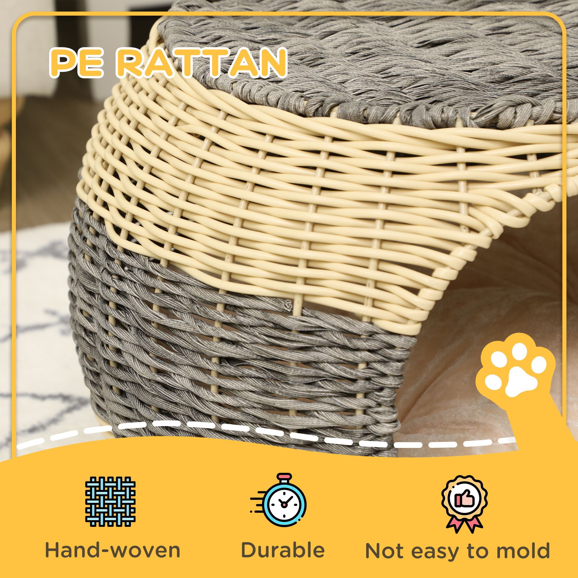 - PE rattan: Combined with steel, this durable and stable cat cave can support up to 3.5kg. Their fur won't get tangled in the burr-free woven surface.