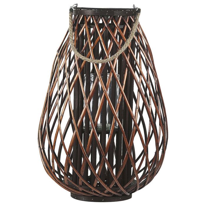 Take care of a romantic lighting in your indoors or outdoors. This tall brown lantern is made of sturdy and highly aesthetic willow wood that will bring a large dose of boho character into a living room, a balcony or patio. Place it just beside a garden sofa set or between outdoor loungers to enjoy its the delicate candlelight all evening. Details: Color: Brown. Main material: Willow Wood. Additional material: Glass. Weight: 2 Assembly: Does Not Require Assembly Wood type: Salix Wood Origin: China