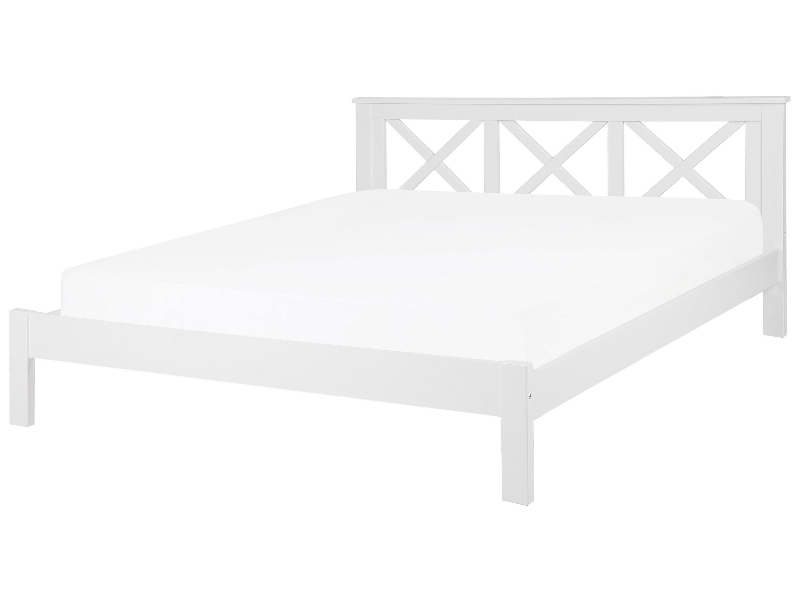Featuring an extremely modern and refined design, this wooden bed will become the perfect centrepiece of any bedroom, infusing a calm ambience touch. The frame is made from pine wood, and the slatted base ensures your mattress is kept firmly in place at all times. The headboard showcases a symmetrical criss-cross detailing, adding a sophisticated hint of mid-century flair. With its classic white finish, this bed gives off a bright and clean-line appearance. Details: Color: White. Main material: Pine Wood. Weight: 34 Assembly: Full Assembly Required Wood type: Pinus massoniana Wood Origin: New Zealand Weight Capacity: 160 Legs Height: 38 Sleeping Surface: 180x200