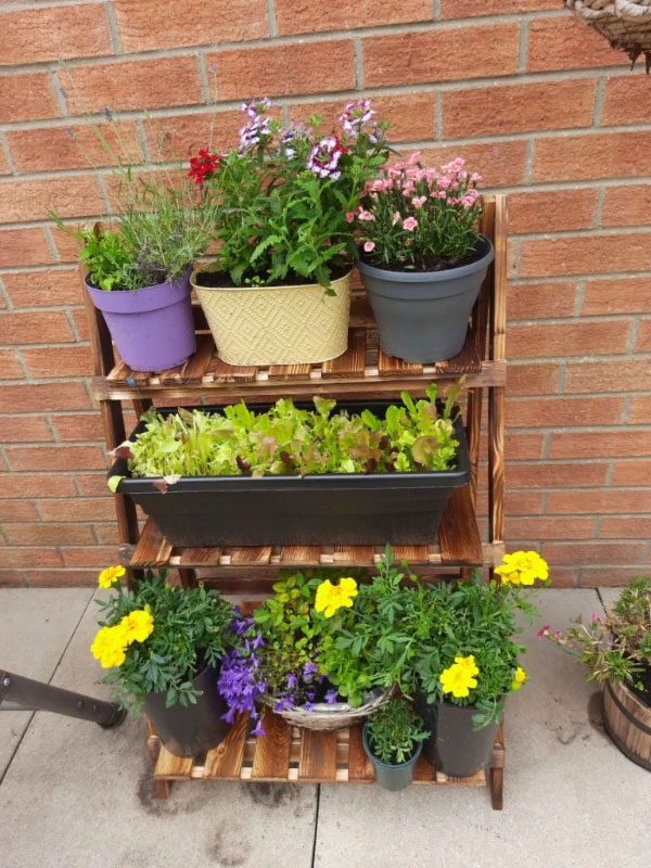 - Position your flower and plants on the three storage tiers in a pleasing arrangement