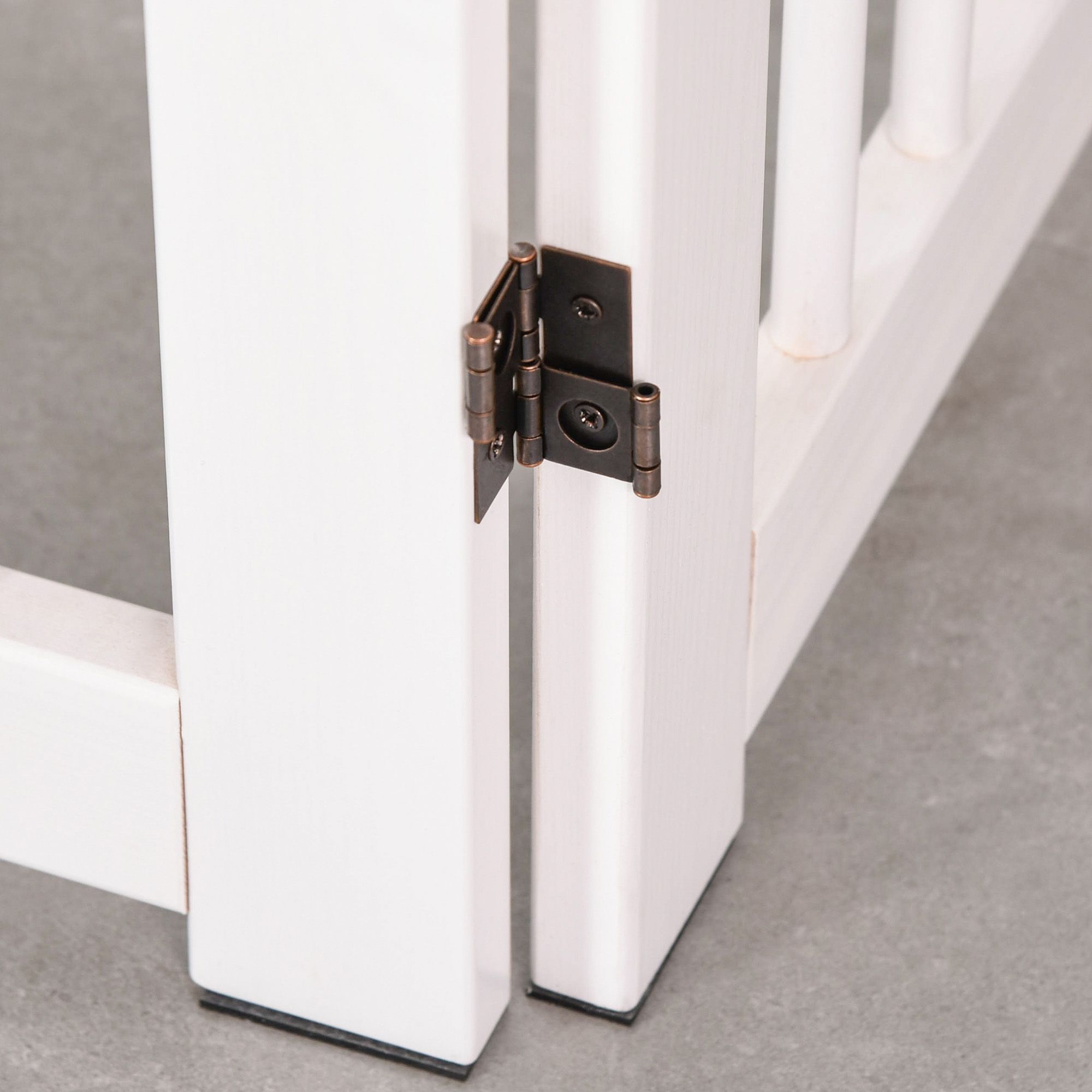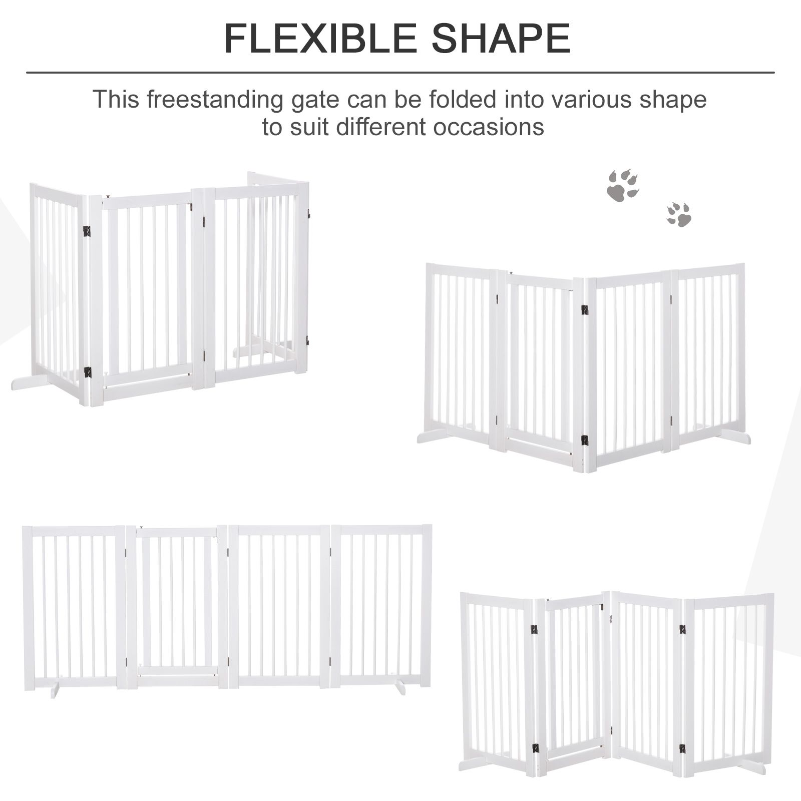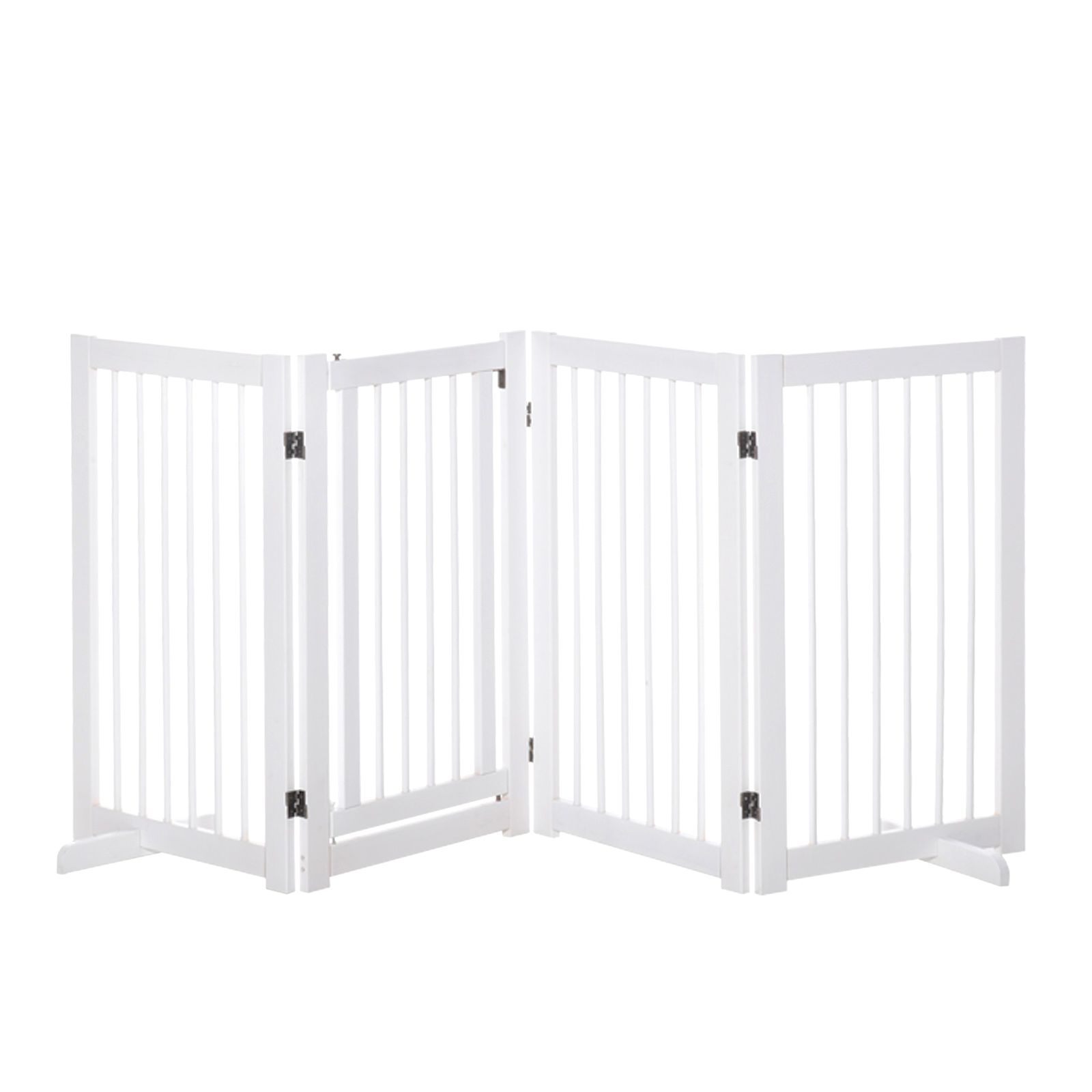 Wooden Freestanding Pet Gate 4 Panels 91cm Foldable Dog Safety Fence with 2 Support Feet Walk-through Door for Doorway Stairs White