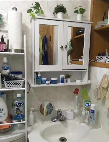 Wooden Hanging Medicine Organizer with Mirror and Adjustable Shelf-White