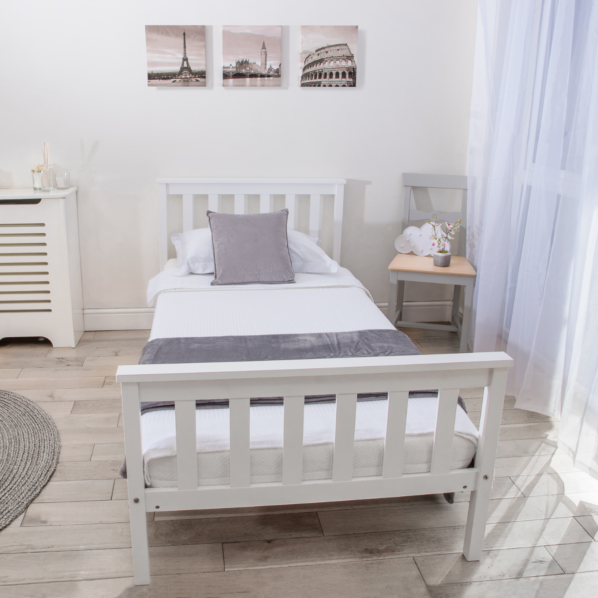 Single wooden bed frame with smooth white finish. The stylish design will compliment any interior Perfect for adults children and teenagers alike. High quality solid pine construction for stability and durability. Structurally tested to British Standard