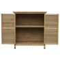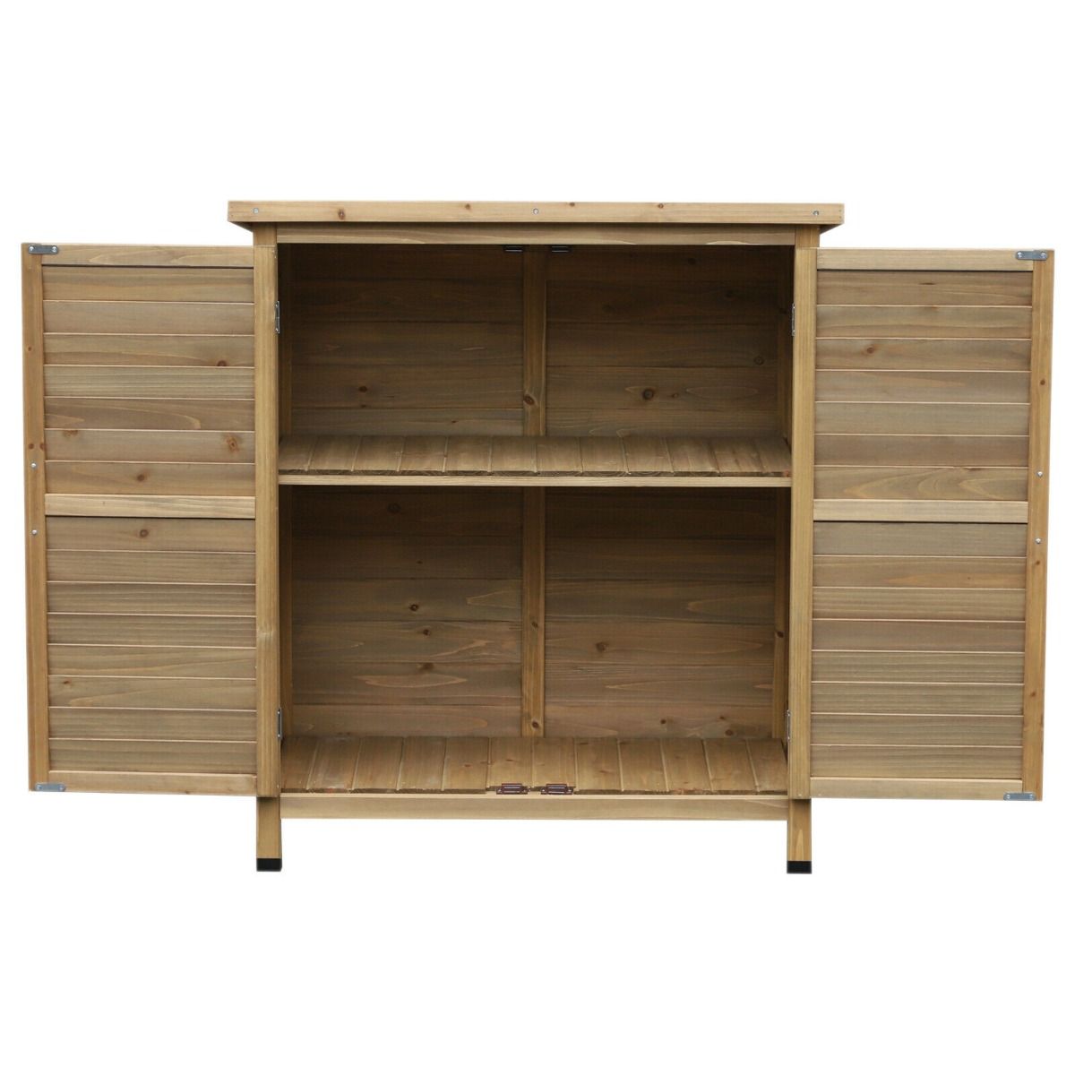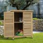 This garden storage cabinet crafted from solid fir wood with a top coat, this garden storage utility is resistant to stains, water, corrosion and mildew to ensure long term use against everyday wear and tear. Inside os the vertical storage shed are two spacious and sturdy shelves with shutter style doors that provide enough ventilation when closed. On the shed top sits a tilted roof with a felt top to stop any water build-up. This outdoor shed is the perfect storage compartment for your gardening tools, outerwear and shoes and more.
