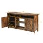 Ample Storage Space: The tabletop is spacious enough to hold a 65-inch TV and some decorations. The open compartments and shelves are ideal for placing DVD players, speakers, set-top boxes, and other media or gaming devices. Besides, two side cabinets with barn doors provide additional storage space for books, crafts, and sundries.Detachable Middle Shelf: The middle shelf of the TV stand can be removed to place an 18-inch electric fireplace (not included), which allows you and your family to sit in front of the TV and enjoy a warm leisure time even in the cold winter. You can also choose to install the middle shelf to store items as needed.Sturdy and Durable Construction: Made of high-quality engineered wood with melamine veneer, this industrial TV cabinet has long-term wear resistance and is not easy to deform or crack. 5 heavy-duty legs provide excellent load-bearing capacity, ensuring a stable structure without easy wobbling.Humanized Cable Management Holes: 4 cable management holes on the back of the TV stand cabinet make it easier to organize the wires of the audio-visual equipment so that you can say goodbye to clutter. In addition, this intimate design also facilitates ventilation and heat dissipation of electrical equipment.Multipurpose Entertainment Center: This farmhouse TV unit can not only be used to hold a TV but also can be used as a console table or display cabinet for your daily necessities. You can choose wherever you like to place this entertainment center based on the configuration of the room.