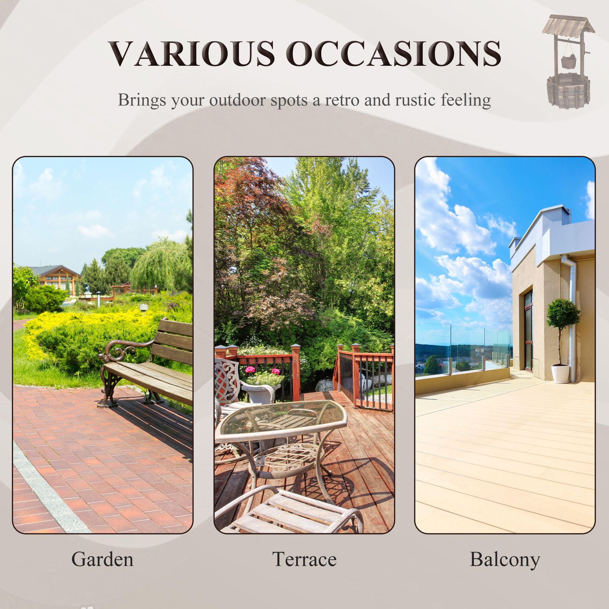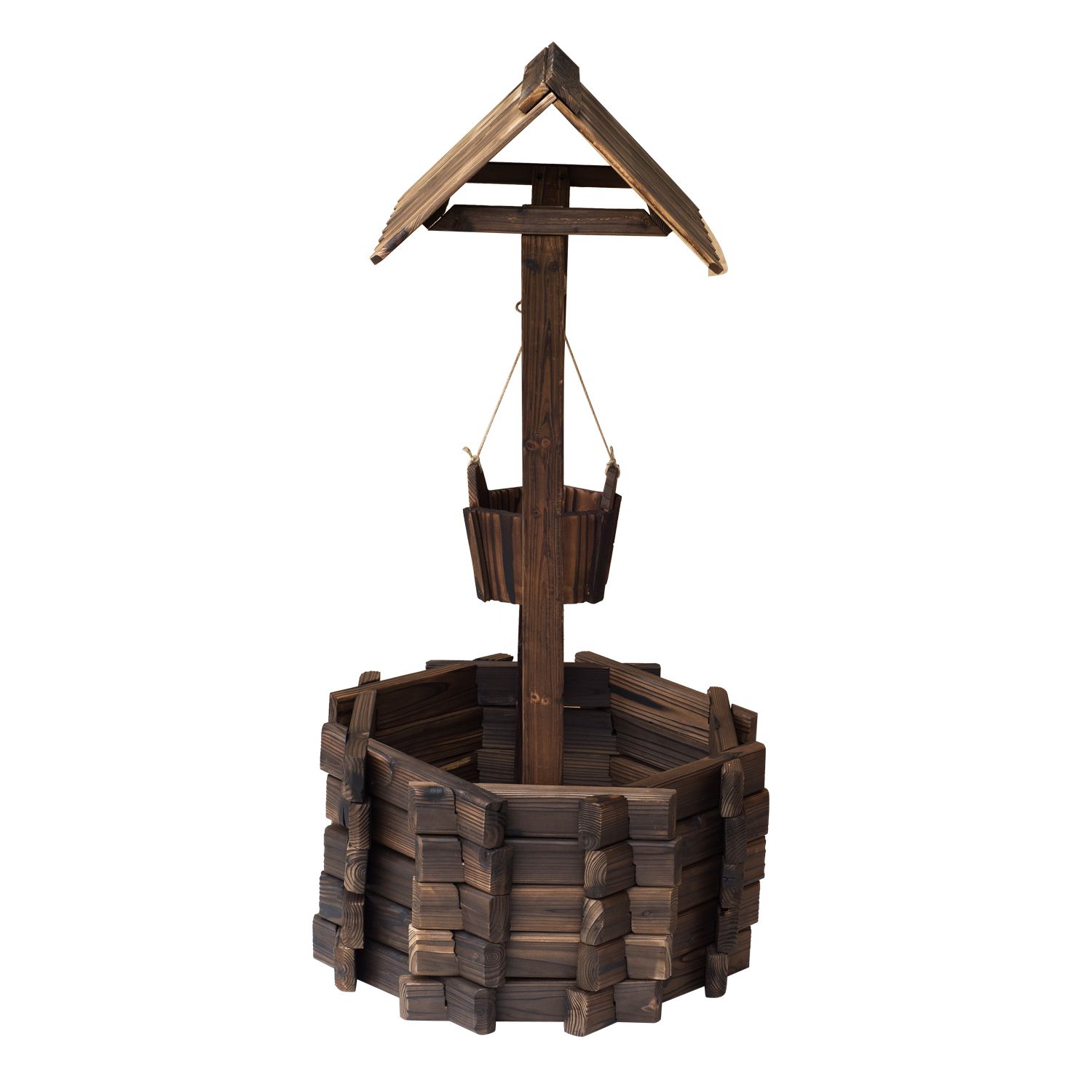 water well planter will add an elegant and stylish look to your lawn or garden. Features burnt-like wood finish for a rustic appearance and fir wood construction keep the planter durable and long-lasting. Place various plants in the wishing well with large area and open base. The mini bucket is designed to place smaller plants and flowers at once. The garden planter features a top hut and a spacious well, which adds a fairytale accent to your garden or front yard.