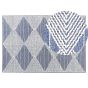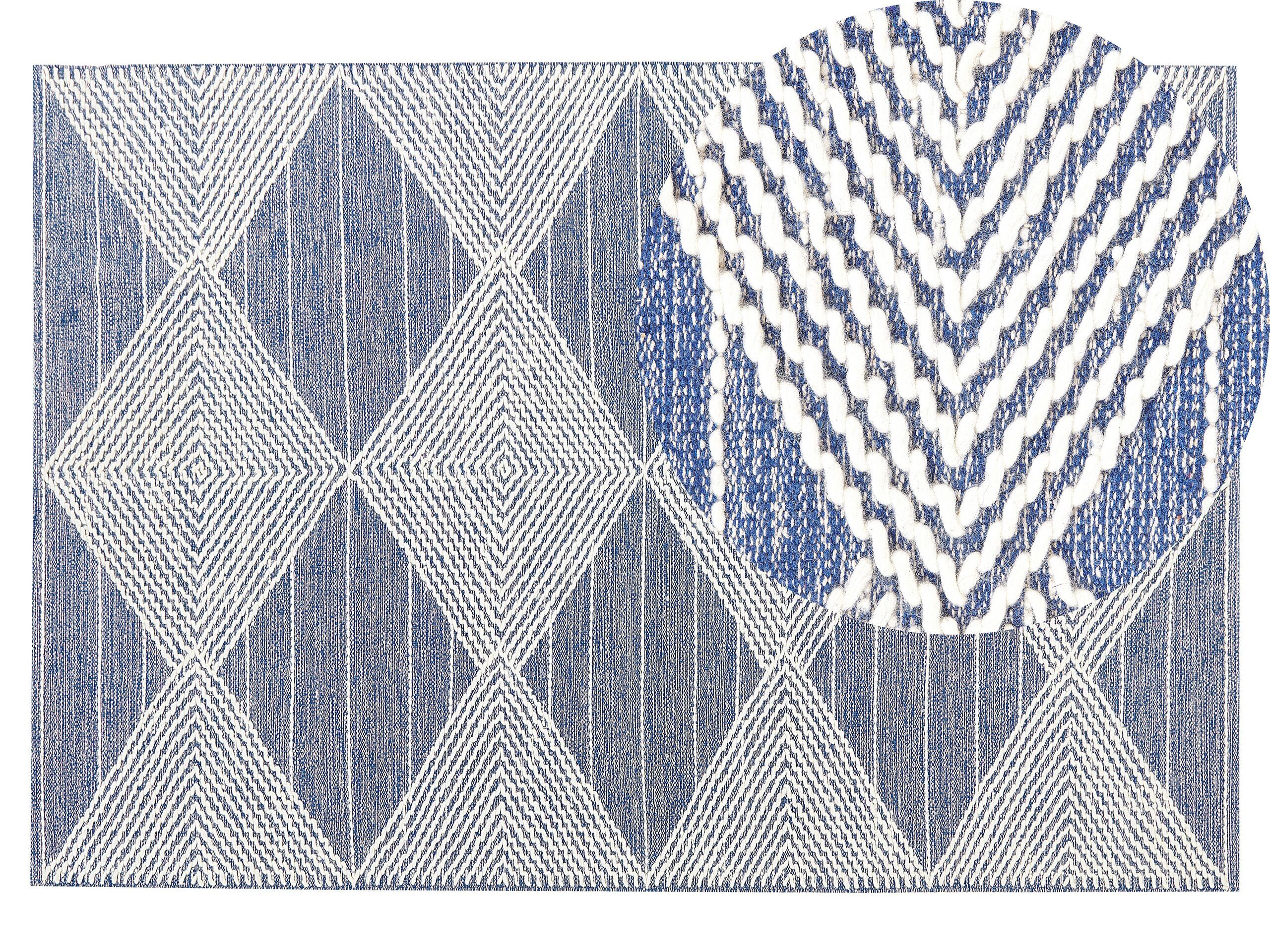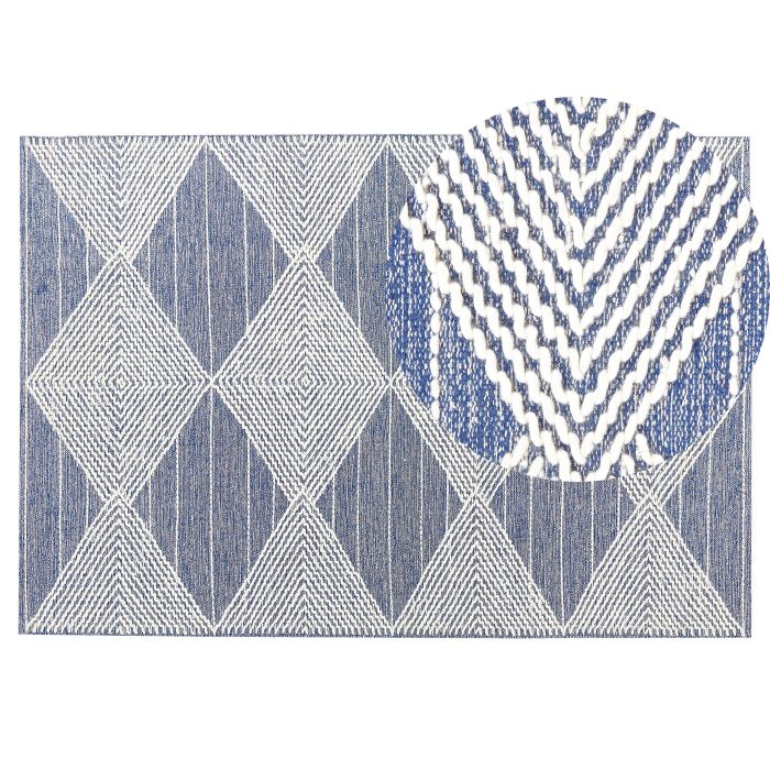 This area rug combines high-quality materials and a Boho design. It is made of wool and polyester, known for its durability and soft texture. The handwoven geometric pattern showcases diamonds in faded hues of blue and light beige for a sophisticated look. Details: Color: Blue, Beige. Main material: Wool. Additional material: Polyester, Cotton. Weight: 4 Assembly: Does Not Require Assembly
