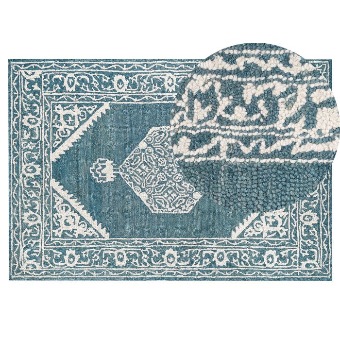 Complete the look of your living room or bedroom with an extraordinary oriental accent. This rug features a unique pattern in white, nicely corresponding with the blue background. This look will perfectly blend in with modern as well as retro-styled interiors. The piece is hand tufted from high-quality and soft-to-the-touch wool fibre. Details: Color: Blue, White. Main material: Wool. Material Composition: 100% Wool Weight: 12.2 Assembly: Does Not Require Assembly