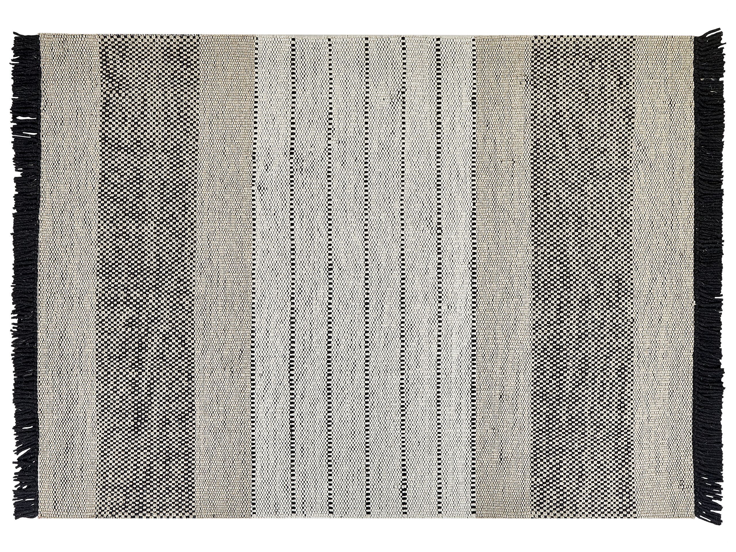 Spruce up the look of your interior with warm accessories and textiles that will turn any space into a cosy nook. This area rug thanks to its simple design, neutral colours and decorative tassels can be a nice addition to rooms in various styles. What is more, the product was hand woven with high attention to detail from natural materials that guarantee durability, thanks to which you will admire its beauty for years to come. Details: Color: Beige, Black. Main material: Wool. Additional material: Cotton. Material Composition: 95% Wool, 5% Cotton Weight: 8.7 Assembly: Does Not Require Assembly