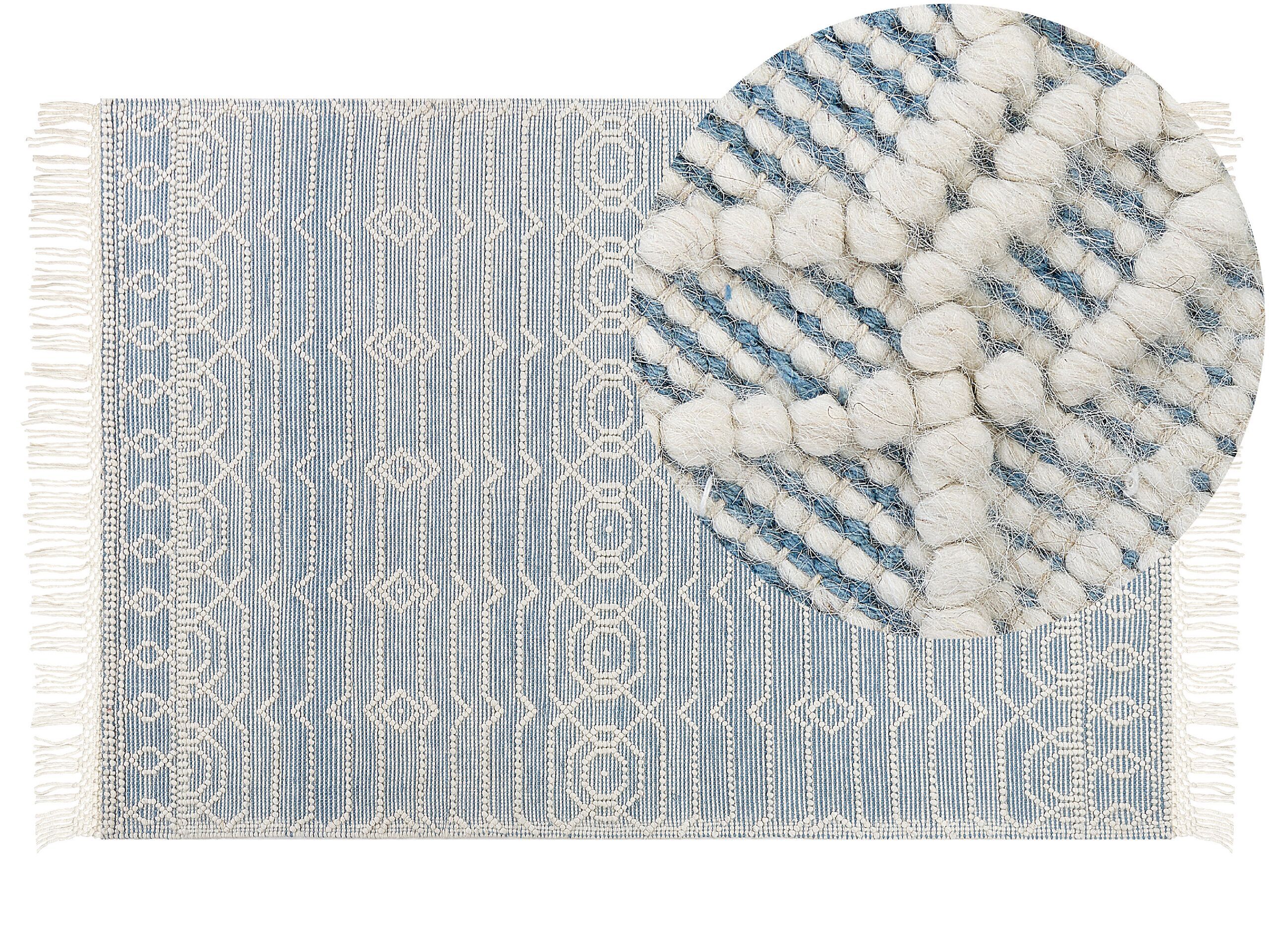 This wool rug is going to stand out in your home and draw the attention of all house guests. The piece is handmade out of high-quality materials, which makes it very durable, but at the same time - soft and pleasant to touch. That makes it a wonderful addition to traffic heavy areas, such as living room or bedroom. Warm, light blue colour, mixed with white, allows to match the accessory with a variety of interior decor styles, from retro to modern. Details: Color: Blue, White. Main material: Wool. Additional material: Polyester. Material Composition: 55% Wool, 35% Polyester, 10% Cotton Weight: 8 Assembly: Does Not Require Assembly