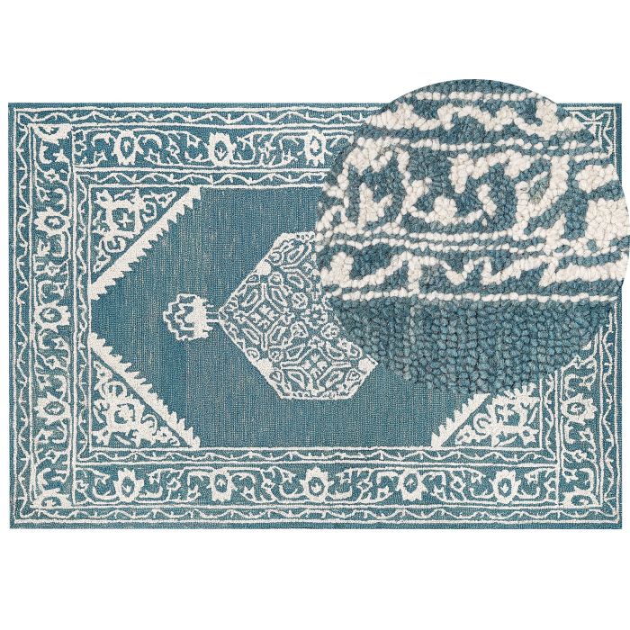 Complete the look of your living room or bedroom with an extraordinary oriental accent. This rug features a unique pattern in white, nicely corresponding with the blue background. This look will perfectly blend in with modern as well as retro-styled interiors. The piece is hand tufted from high-quality and soft-to-the-touch wool fibre. Details: Color: Blue, White. Main material: Wool. Material Composition: 100% Wool Weight: 13.4 Assembly: Does Not Require Assembly