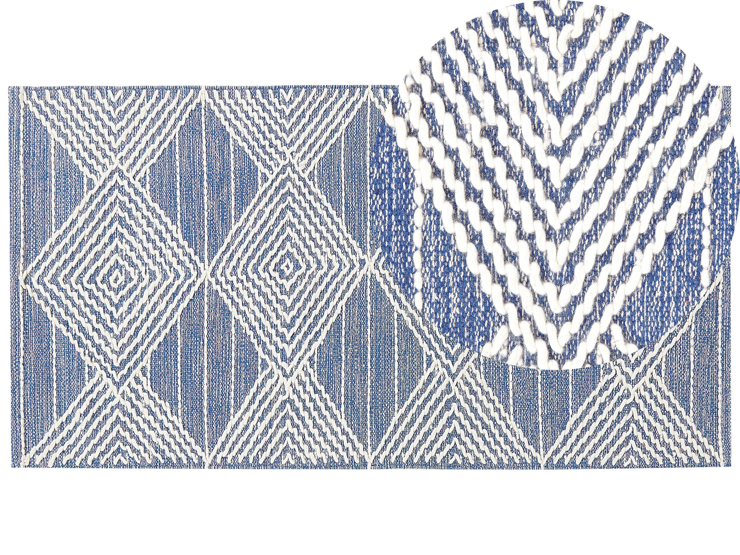 This area rug combines high-quality materials and a Boho design. It is made of wool and polyester, known for its durability and soft texture. The handwoven geometric pattern showcases diamonds in faded hues of blue and light beige for a sophisticated look. Details: Color: Blue, Beige. Main material: Wool. Additional material: Polyester, Cotton. Weight: 2 Assembly: Does Not Require Assembly