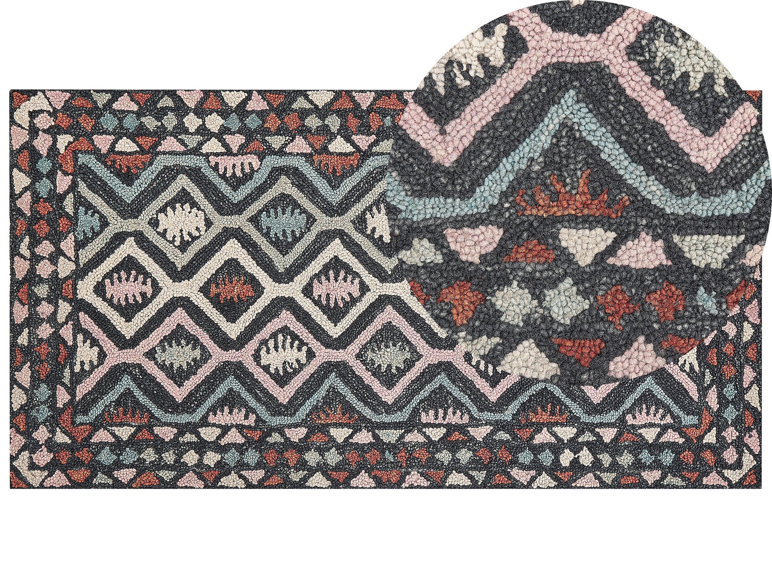 Add a unique touch to your interior with an exceptional rug that will certainly attract the attention of your guests. This special piece of decoration with its colourful tribal-inspired pattern on a universal black background will nicely complement any modern or boho interior. The product is hand tufted from high-quality wool fibre for an upscale look. Details: Color: Multicolour. Main material: Wool. Material Composition: 100% Wool Weight: 5.3 Assembly: Does Not Require Assembly