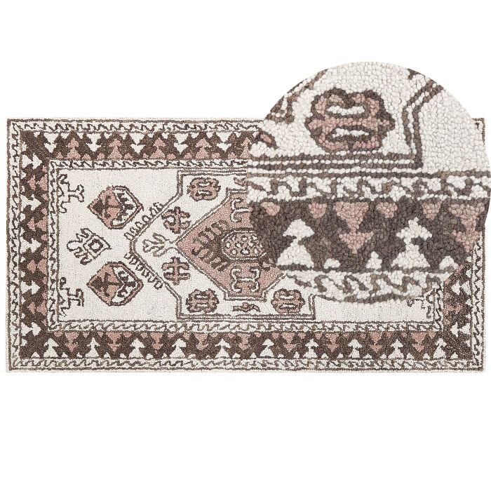 Make your interior feel cosy and snug thanks to the rugs and textiles of high-quality. This unique rug is hand tufted from soft-to-the-touch wool fibre that will please your feet whenever you step on it. The orient-inspired, tribal pattern adds a bit of a boho touch, which thanks to the muted colours will nicely correspond with various interiors. Details: Color: Multicolour, Brown, Pink. Main material: Wool. Material Composition: 100% Wool Weight: 5 Assembly: Does Not Require Assembly