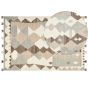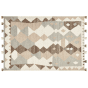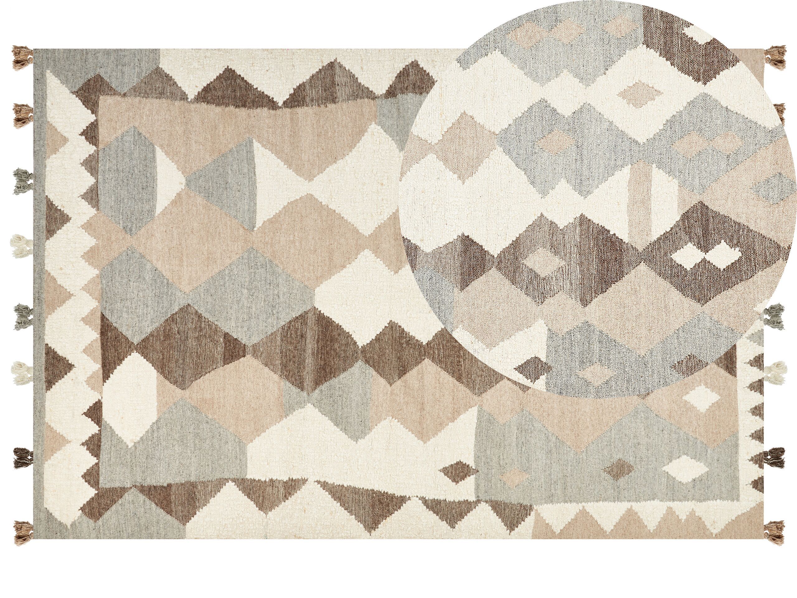 Introduce a boho vibe to your living space with this rectangular, handmade kilim rug. The piece was crafted out of wool and cotton, which makes it especially durable, while also remaining soft and pleasant to touch. Its surface is covered with patches of brown, beige and grey shades, so the rug can be matched with a variety of other decorations. Details: Color: Multicolour, Beige, Brown, Grey. Main material: Wool. Additional material: Cotton. Material Composition: 85% Wool, 15% Cotton Weight: 10 Assembly: Does Not Require Assembly