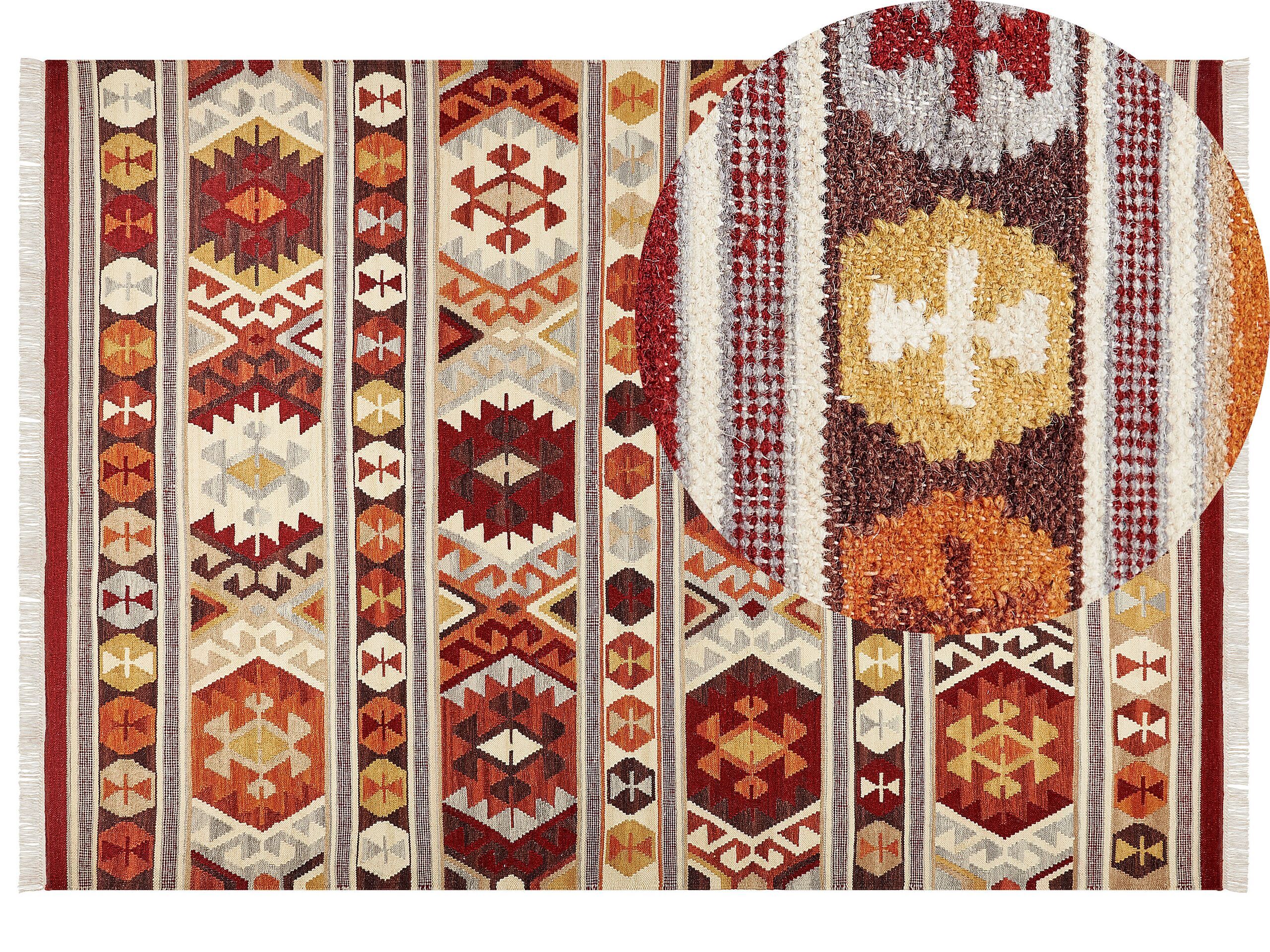 Invite vibrant energy into your space with this exceptional kilim rug. Expertly handwoven using a blend of soft wool and cotton, it offers a luxurious texture that delights your feet with every step. The tribal-inspired geometric pattern creates a mesmerising tapestry of bold hues of red and orange that introduce the feeling of warmth to any interior. Details: Color: Multicolour, Orange, Red, Brown. Main material: Wool. Additional material: Cotton. Material Composition: 80% Wool, 20% Cotton Weight: 9 Assembly: Does Not Require Assembly