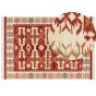 Immerse your space in a vibrant ambience with this extraordinary kilim rug. Meticulously handcrafted using a combination of plush wool and cotton, it provides a lavish texture that indulges your feet with each stride. Drawing inspiration from tribal aesthetics, the intricate geometric design weaves a captivating tapestry of vivid shades, infusing your interior with delightful warmth. Details: Color: Multicolour, Orange, Red, Brown. Main material: Wool. Additional material: Cotton. Material Composition: 80% Wool, 20% Cotton Weight: 9 Assembly: Does Not Require Assembly