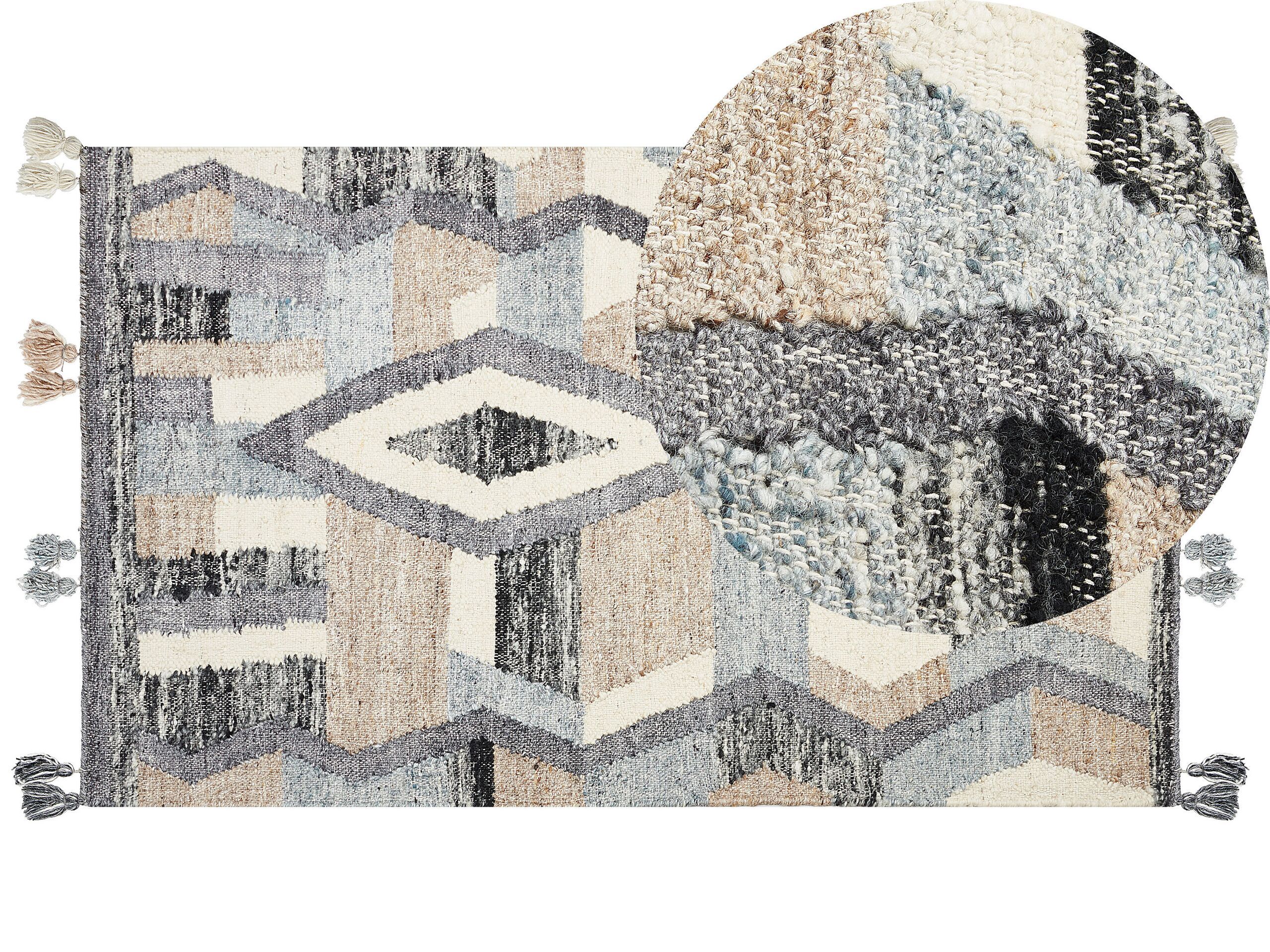 Introduce this exceptional kilim rug to your interior and embrace the harmonious blend of traditional technique and contemporary finesse. Handwoven with the utmost care from soft wool with the addition of cotton, it caresses the feet with a gentle touch. The interesting geometric pattern, inspired by timeless motifs in composition with the muted hues of grey and beige, gracefully adorns the surface. Details: Color: Multicolour, Grey, Blue, Beige. Main material: Wool. Additional material: Cotton. Material Composition: 85% Wool, 15% Cotton Weight: 2 Assembly: Does Not Require Assembly