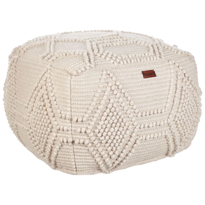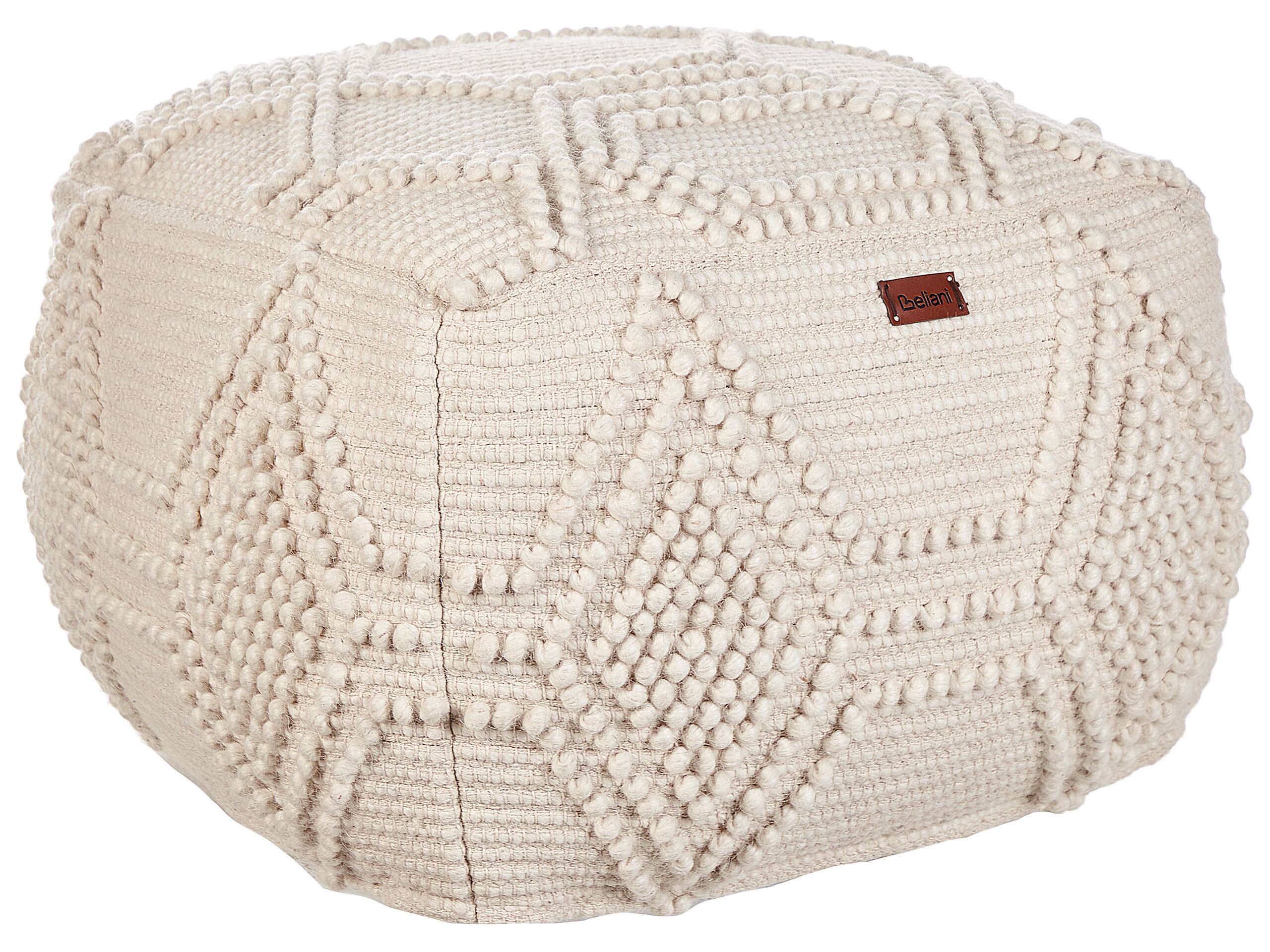 This handcrafted wool pouffe is a delightful expression of boho style with a plush, inviting texture. Each piece is meticulously handwoven to create a unique, geometric pattern that adds a sophisticated touch to any room. The accessory is perfect for adding an extra seat or a comfortable footrest to any room - and what is more, it brings warmth and a touch of artisanal charm to your home decor. Details: Color: Beige. Main material: Wool. Material Composition: 100% Wool Weight: 2 Assembly: Does Not Require Assembly Weight Capacity: 90