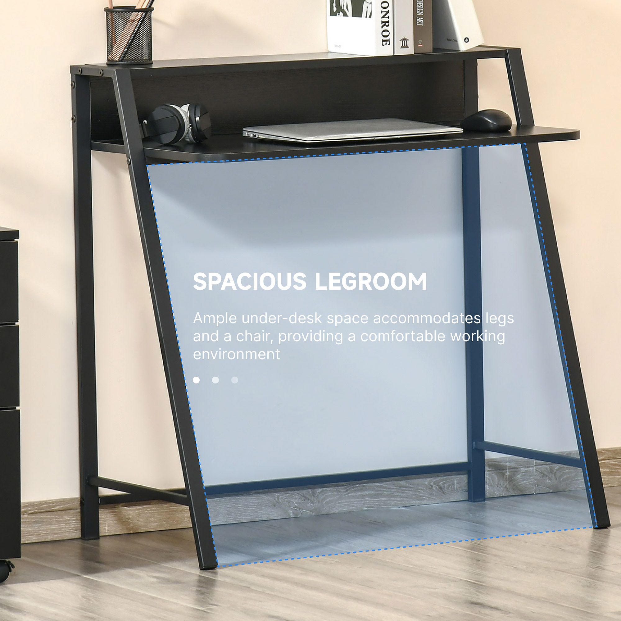 - Plenty of under-desk space for your legs and even a chair