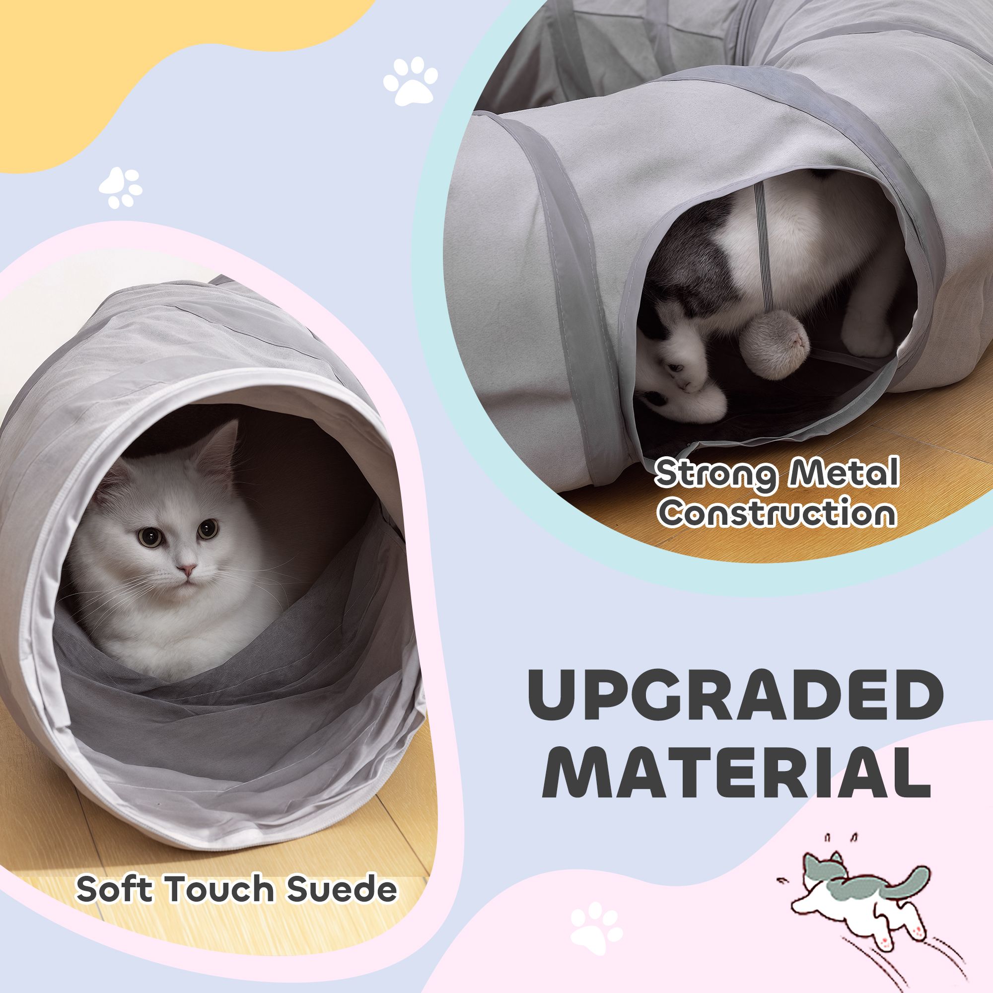 Is your living space overrun with cat toys and beds? Your feline friend needs stimulation but also a secure spot for napping, creating a constant juggle. The PawHut cat play tunnel solves this by merging a playground and a soft bed. Crafted from soft suede, this cat tunnel zips into an S-shape or circle, offering endless fun and a warm, comforting retreat that enhances your cat's well-being and your home's tidiness. Creative design: Combines a cosy bed with a fun tunnel that zips into an S-shape or circle, complete with a door hole and toy ball, this cat tunnel is suitable for both active play and relaxing naps. Easy-to-clean padding: Features a removable, machine-washable central mat for hassle-free cleaning, keeping the cat play tunnel fresh and hygienic without losing its wonderfully soft feel Space-saving: Folds this cat tunnel flat with a gentle press, no disassembly required. Lightweight and easy to tuck away in a cupboard, suitcase, or car boot suitable for vet visits, small homes, or on-the-go adventures. Soft suede material: Crafted from suede polyester for a wonderfully warm and smooth feel, ensuring your cat is perfectly comfortable in their new favourite cat play tunnel