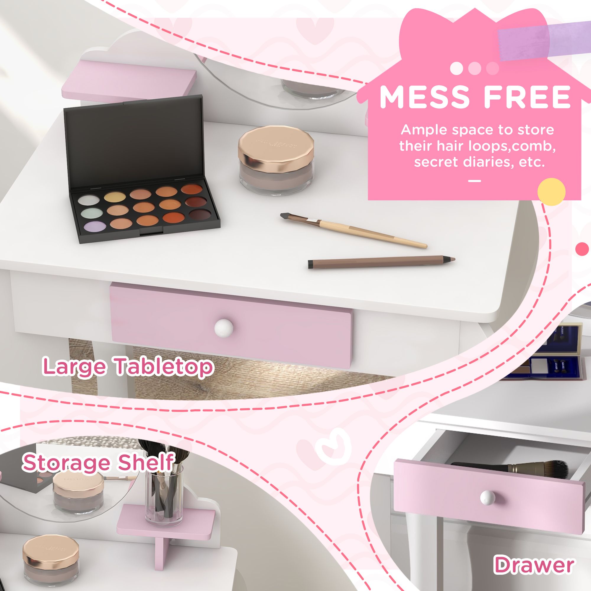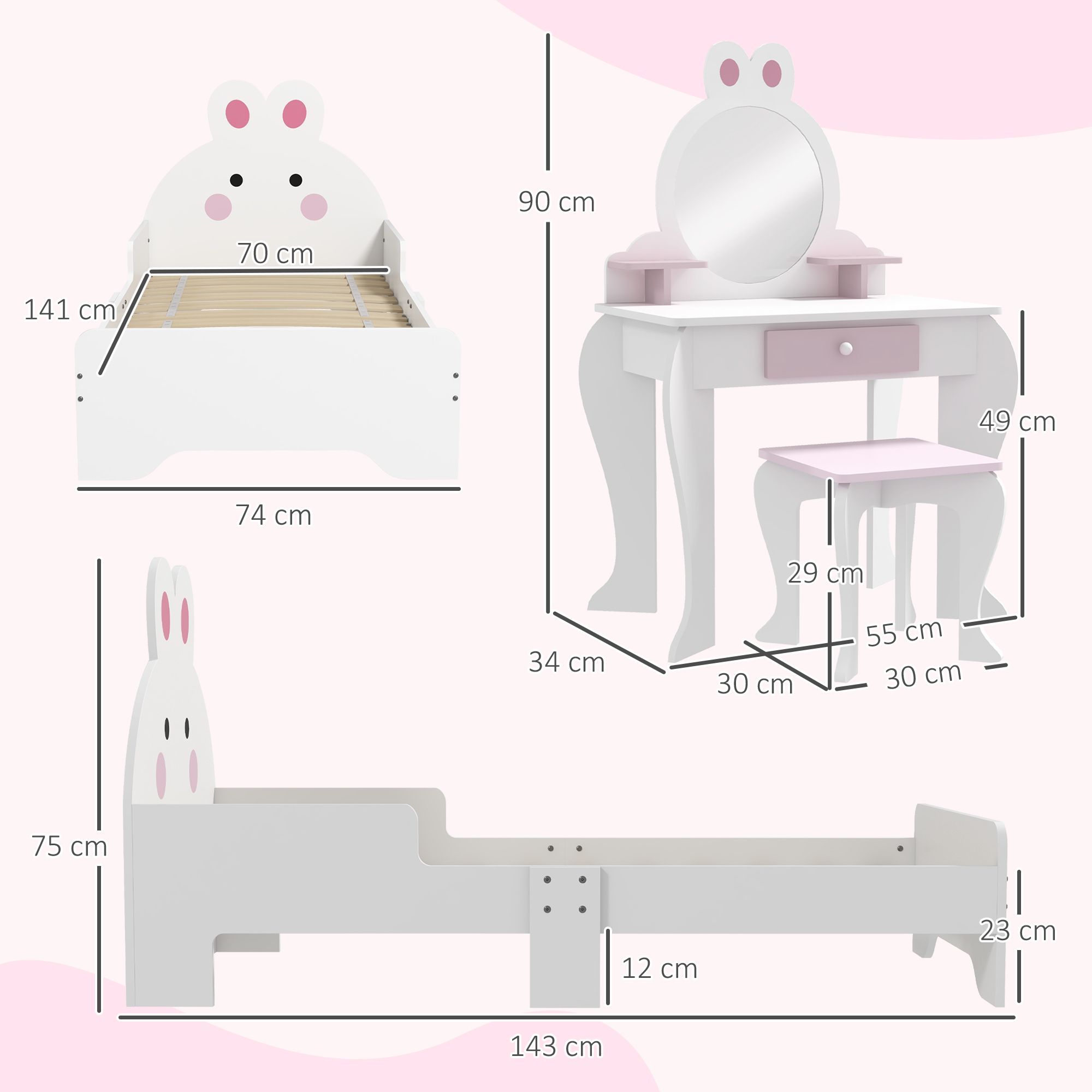 ZONEKIZ Wooden Kids Bedroom Furniture Set with Kids Dressing Table, Stool, Bed, for 3-6 Years, Bunny-Design